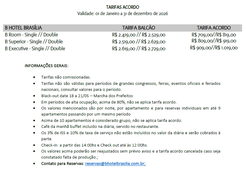 Entre em contato pelos telefones (61) 3962-2600, (61) 3962-2000 e pelo e-mail reservas@bhotel.com.br