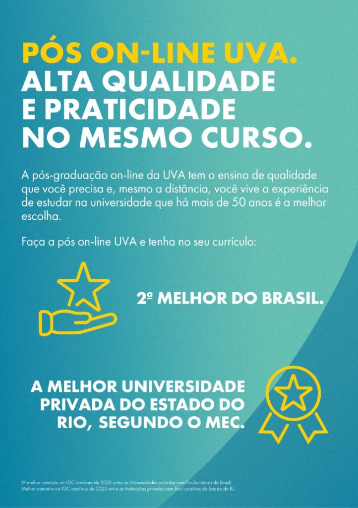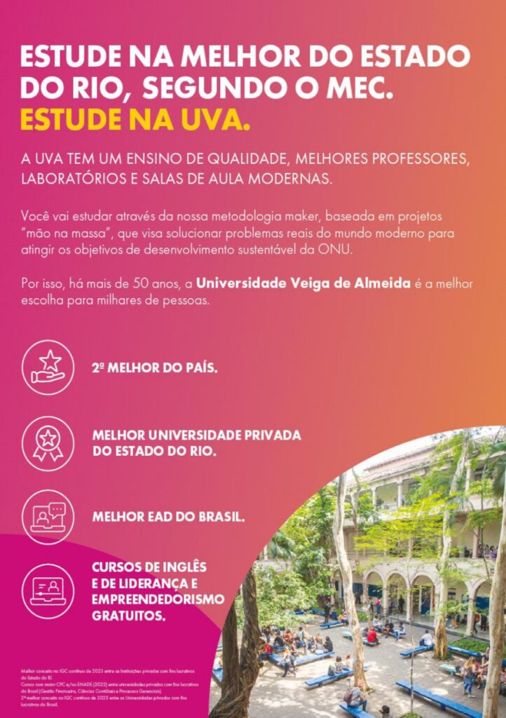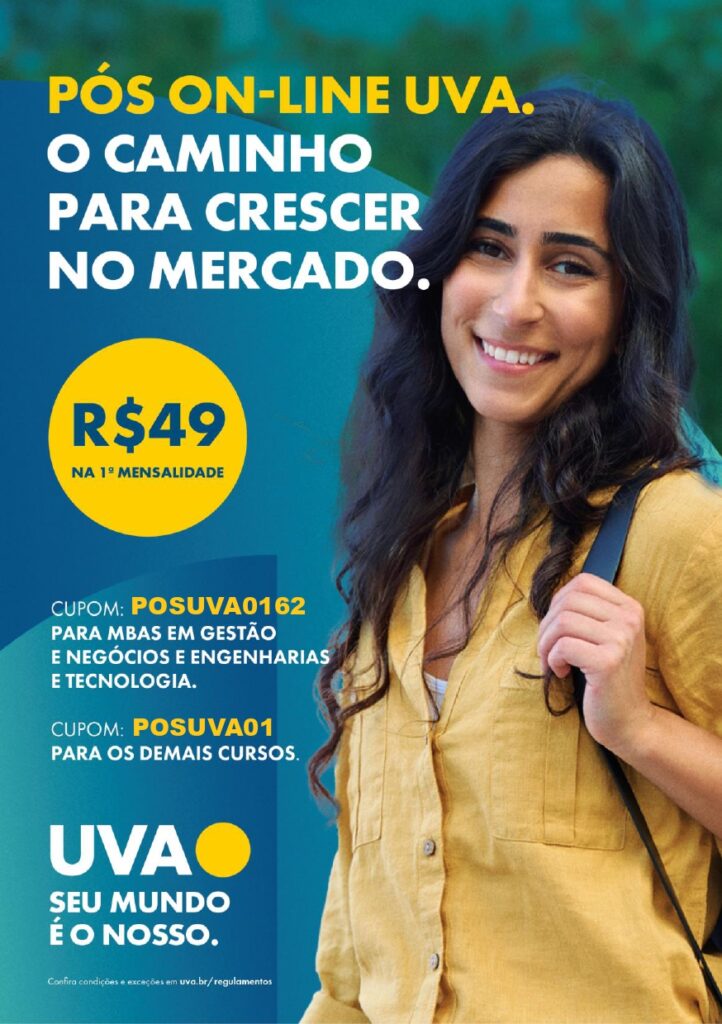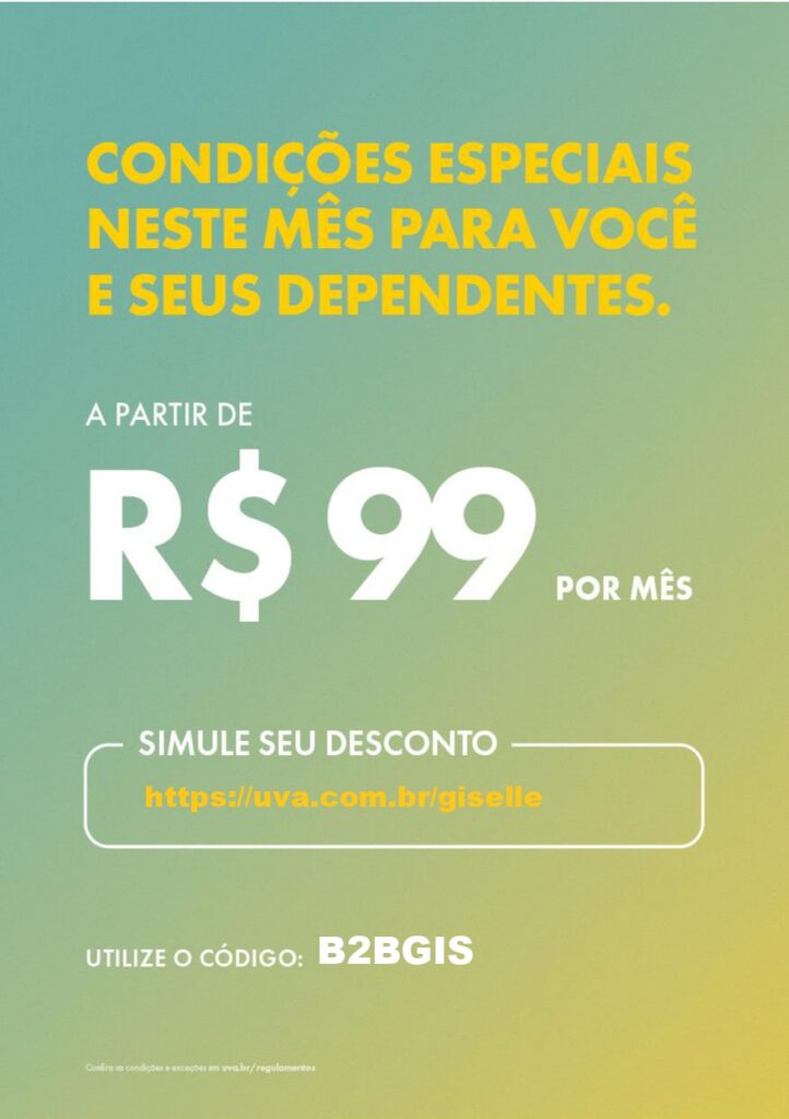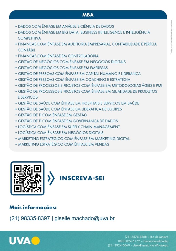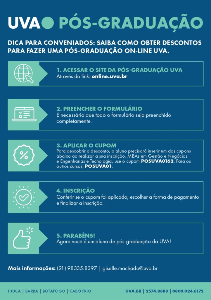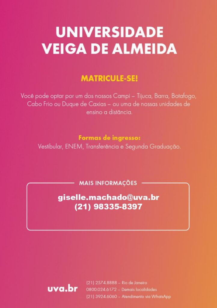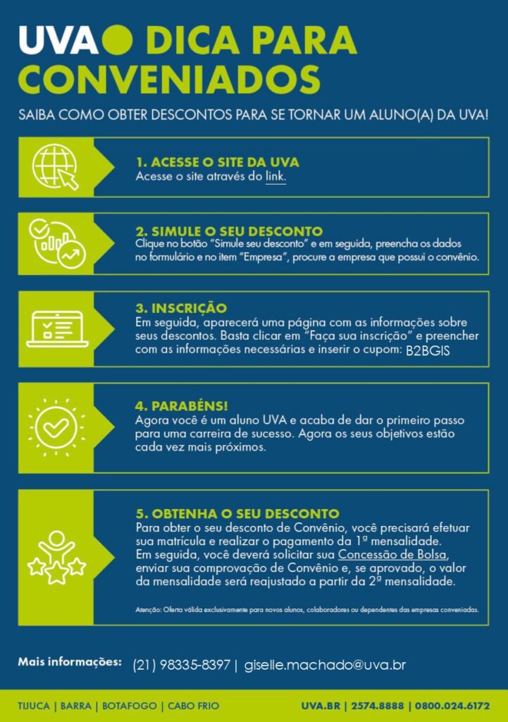 Para mais informações e detalhes das condições do benefício, entre em contato pelo telefone e WhatsApp (21) 98335-8397 e pelo e-mail giselle.machado@uva.br