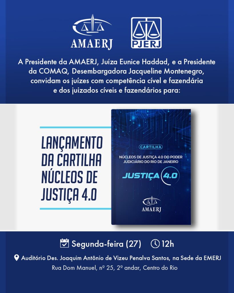 Nesta segunda-feira (27), às 12h, a AMAERJ fará o lançamento da Cartilha Núcleos de Justiça 4.0 do Poder Judiciário do Rio de Janeiro. A presidente da Associação, juíza Eunice Haddad, e a presidente da COMAQ (Comissão de Políticas Institucionais para Eficiência Operacional e Qualidade dos Serviços Judiciais), desembargadora Jacqueline Montenegro, convidam para o evento os juízes com competência cível e fazendária e dos juizados cíveis e fazendários.