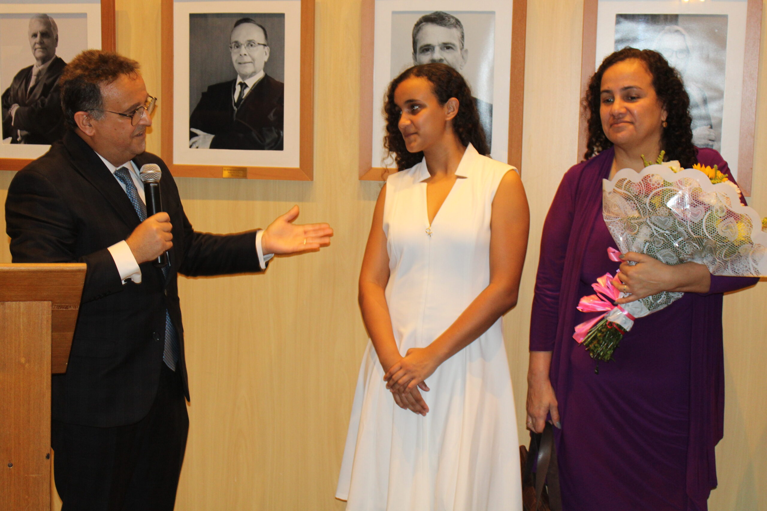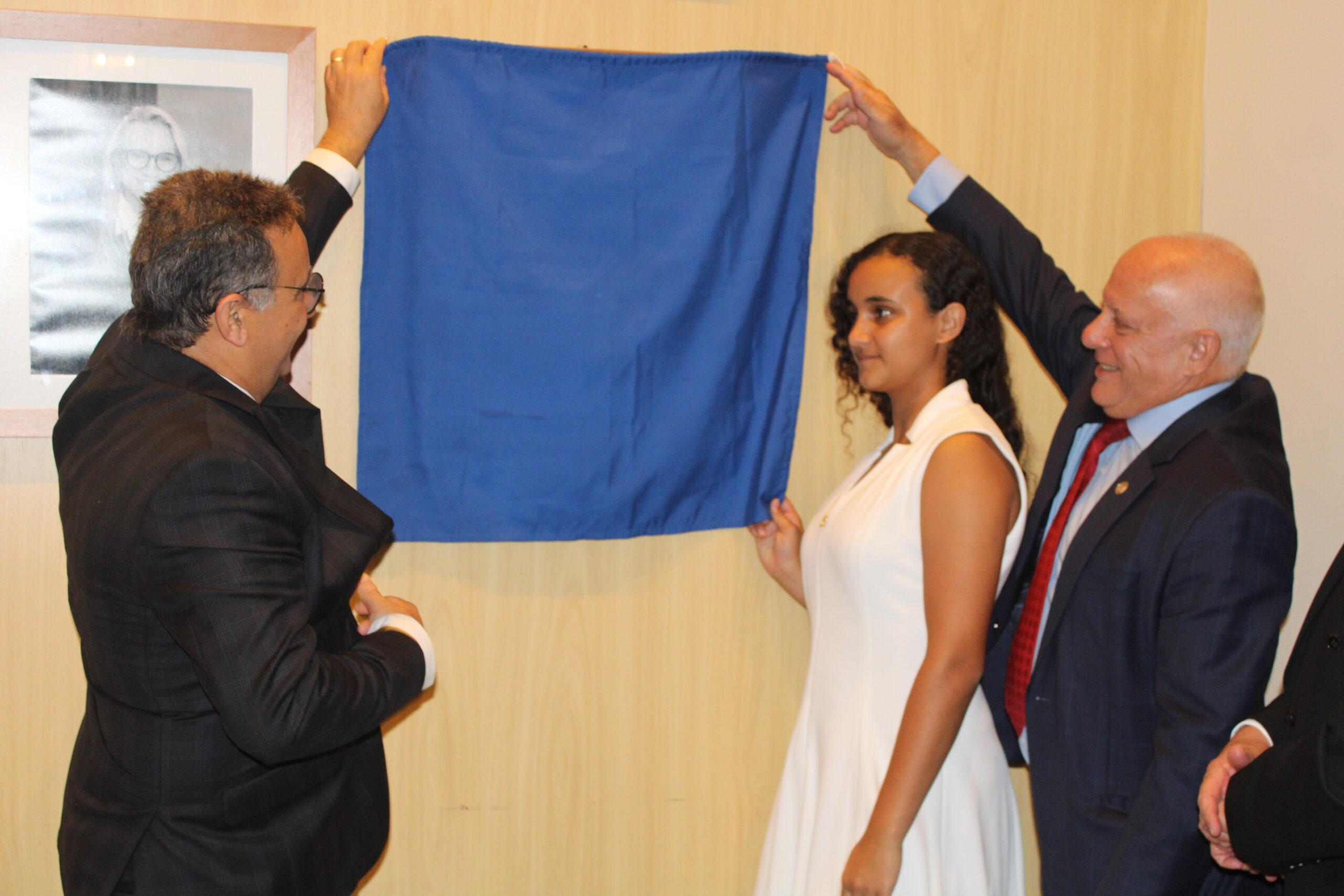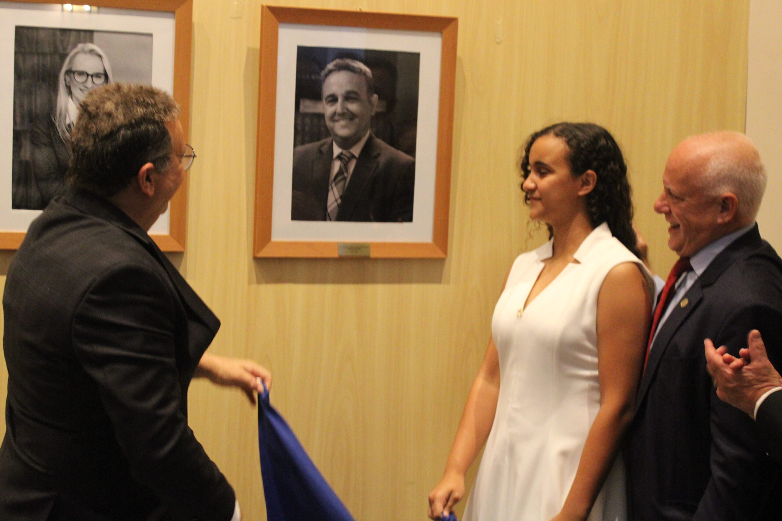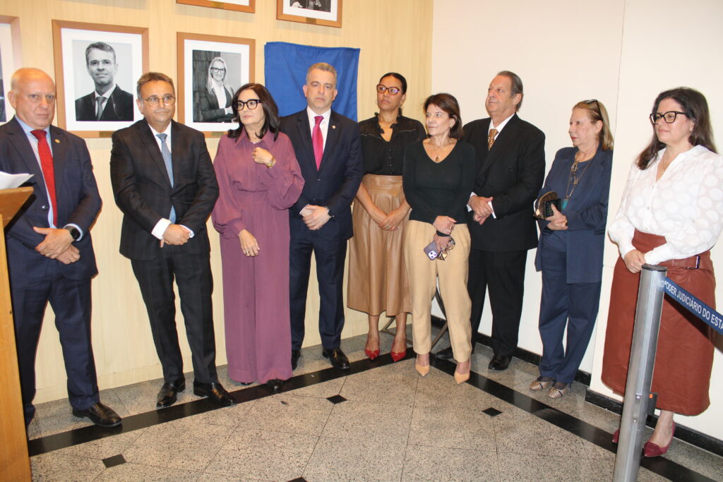 Na galeria de honra, o retrato do desembargador Marco Aurélio Bezerra de Melo foi descerrado pelo homenageado junto à sua filha e ao desembargador Cláudio dell’Orto.