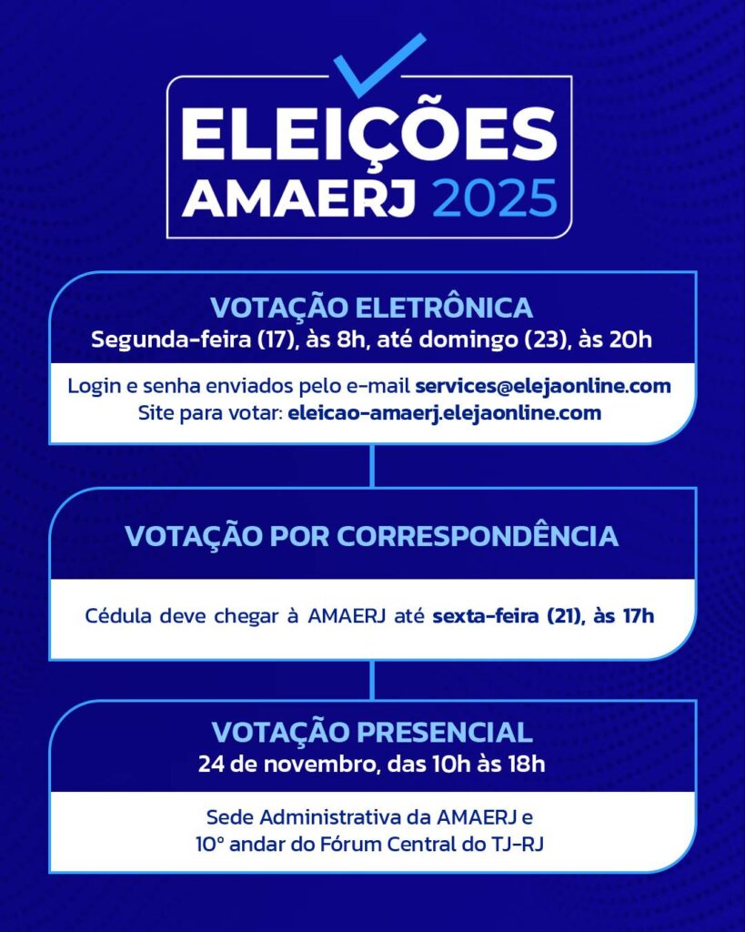 A votação presencial acontecerá em 24 de novembro, das 10h às 18h, na Sede Administrativa da AMAERJ (Rua Dom Manuel, 29, 1º andar, Centro do Rio) e no 10º andar do Fórum Central do Tribunal de Justiça (Rua Dom Manuel, s/n).
