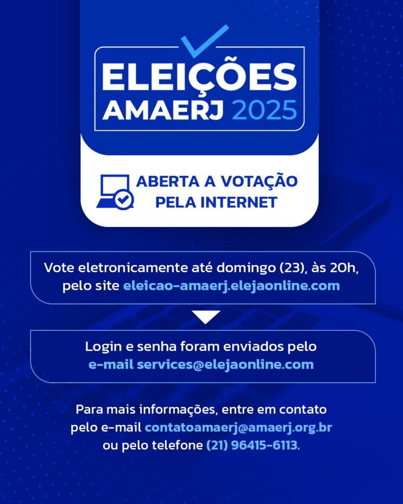 As eleições da AMAERJ começaram na manhã desta segunda-feira (17). Os associados podem votar pela internet até domingo (23), às 20h. Serão eleitos os integrantes da Diretoria Executiva e do Conselho Deliberativo e Fiscal da AMAERJ para o biênio 2026-2027.
