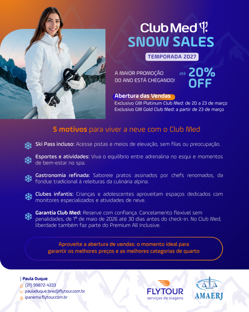 A Flytour, empresa de turismo conveniada à AMAERJ, oferece aos associados até 20% de desconto na hospedagem do Club Med para a temporada de neve de 2027. A promoção especial é válida para resorts na Europa, na Ásia e no Canadá.