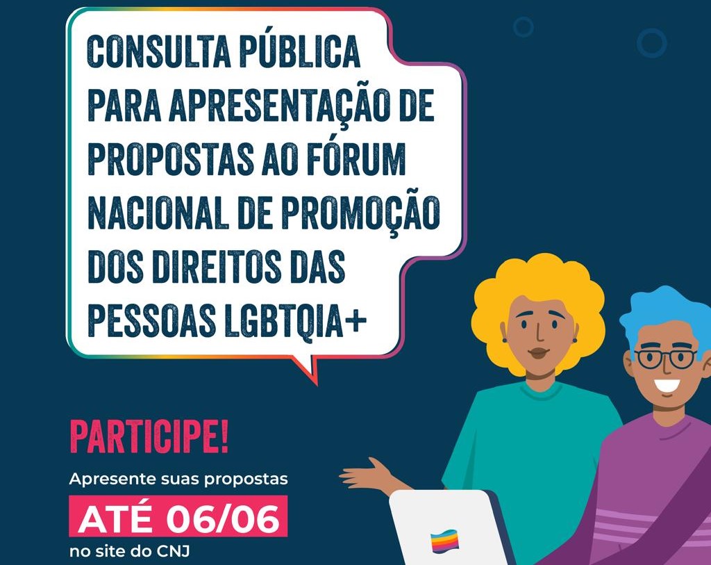 O Conselho Nacional de Justiça (CNJ) disponibilizou consulta pública para receber sugestões para o Fórum Nacional de Promoção dos Direitos das Pessoas LGBTQIA+. A iniciativa visa fortalecer o papel do Poder Judiciário na garantia de direitos, na promoção da igualdade e no enfrentamento da discriminação contra a população LGBTQIA+. Magistrados e profissionais do Direito podem enviar propostas até o dia 6 de junho.