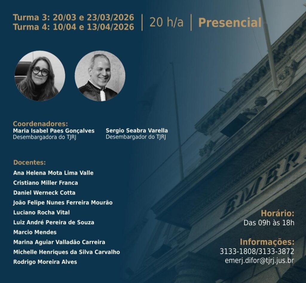 Inscreva-se no site da EMERJ. Para mais informações, entre em contato pelo e-mail emerj.difor@tjrj.jus.br ou pelos telefones (21) 3133-1808 e 3133-3872.