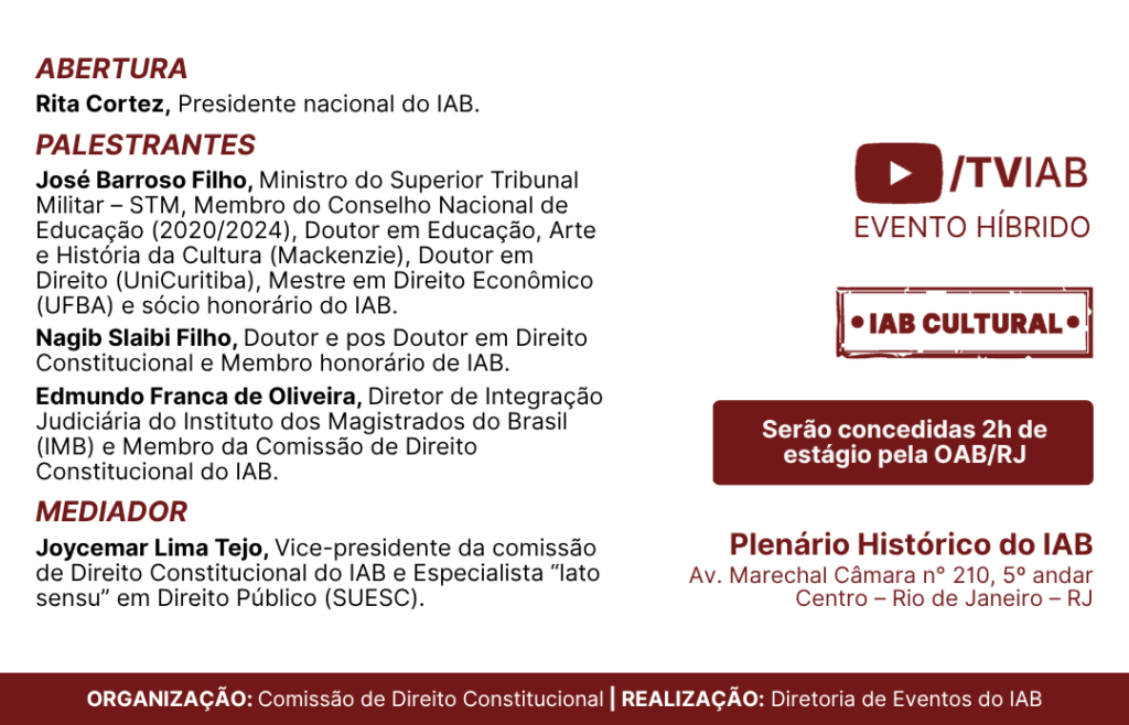 O evento acontecerá às 17h, no plenário do IAB, localizado na Avenida Marechal Câmara, nº 210, 5º andar. A transmissão ao vivo será feita pelo canal oficial da instituição no YouTube.