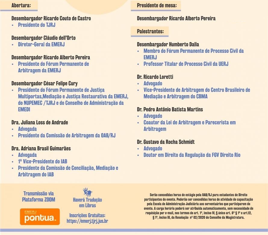 Participarão do evento os desembargadores Ricardo Couto, presidente do TJ-RJ, Cláudio dell’Orto, diretor-geral da EMERJ, Ricardo Alberto Pereira, 1º vice-presidente da AMAERJ e presidente do Fórum de Arbitragem da EMERJ, Cesar Cury, diretor de Estudos e Pesquisas da AMAERJ e presidente do Conselho de Administração da Escola de Mediação (EMEDI), e Humberto Dalla, conselheiro de Estudos e Pesquisas da Associação.