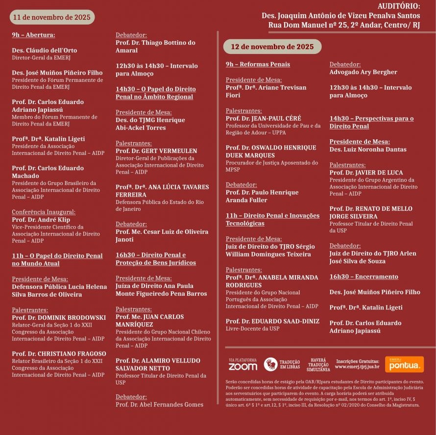 O encontro, organizado pela EMERJ em parceria com a Associação Internacional de Direito Penal (AIDP), será realizado das 9h às 18h, em ambos os dias, no Auditório Desembargador Joaquim Antônio de Vizeu Penalva Santos (Rua Dom Manuel, 25, 2º andar, Centro do Rio de Janeiro).