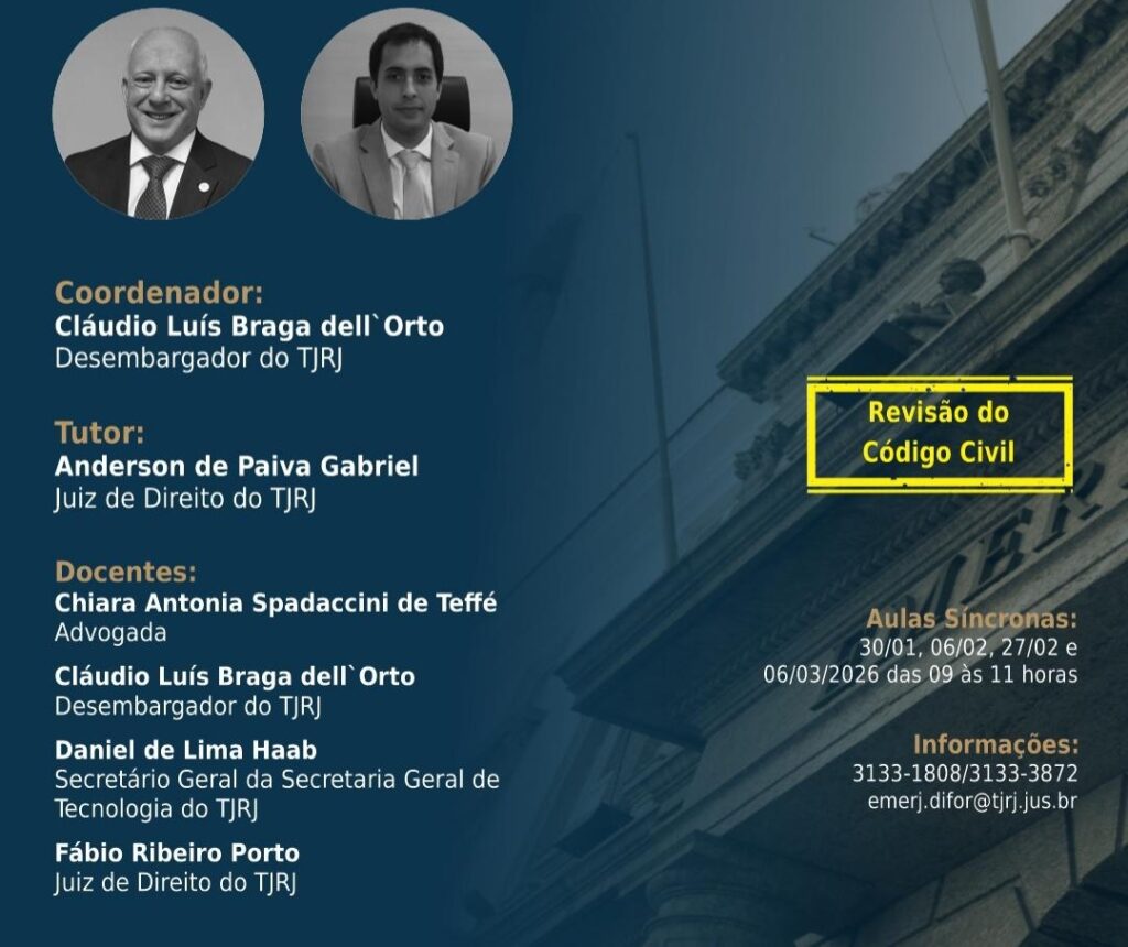 Inscreva-se no site da EMERJ. O curso será oferecido na modalidade Educação a Distância (EaD), por meio das plataformas Moodle e Zoom, com carga horária total de 20 horas e revisão de conteúdos do Código Civil. As aulas síncronas ocorrerão nos dias 30 de janeiro, 2 e 27 de fevereiro e 6 de março, das 9h às 11h.