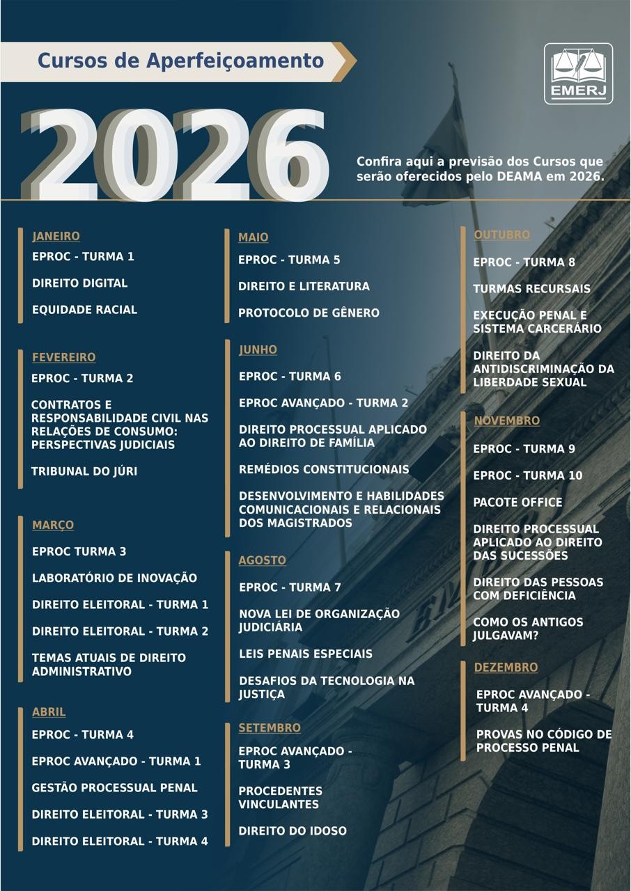 O cronograma de capacitação dos magistrados para 2026 já foi definido pela Escola da Magistratura do Estado do Rio de Janeiro (EMERJ). De acordo com a programação elaborada pelo Departamento de Desenvolvimento de Magistrados (DEAMA), serão oferecidos 43 cursos ao longo de 2026.