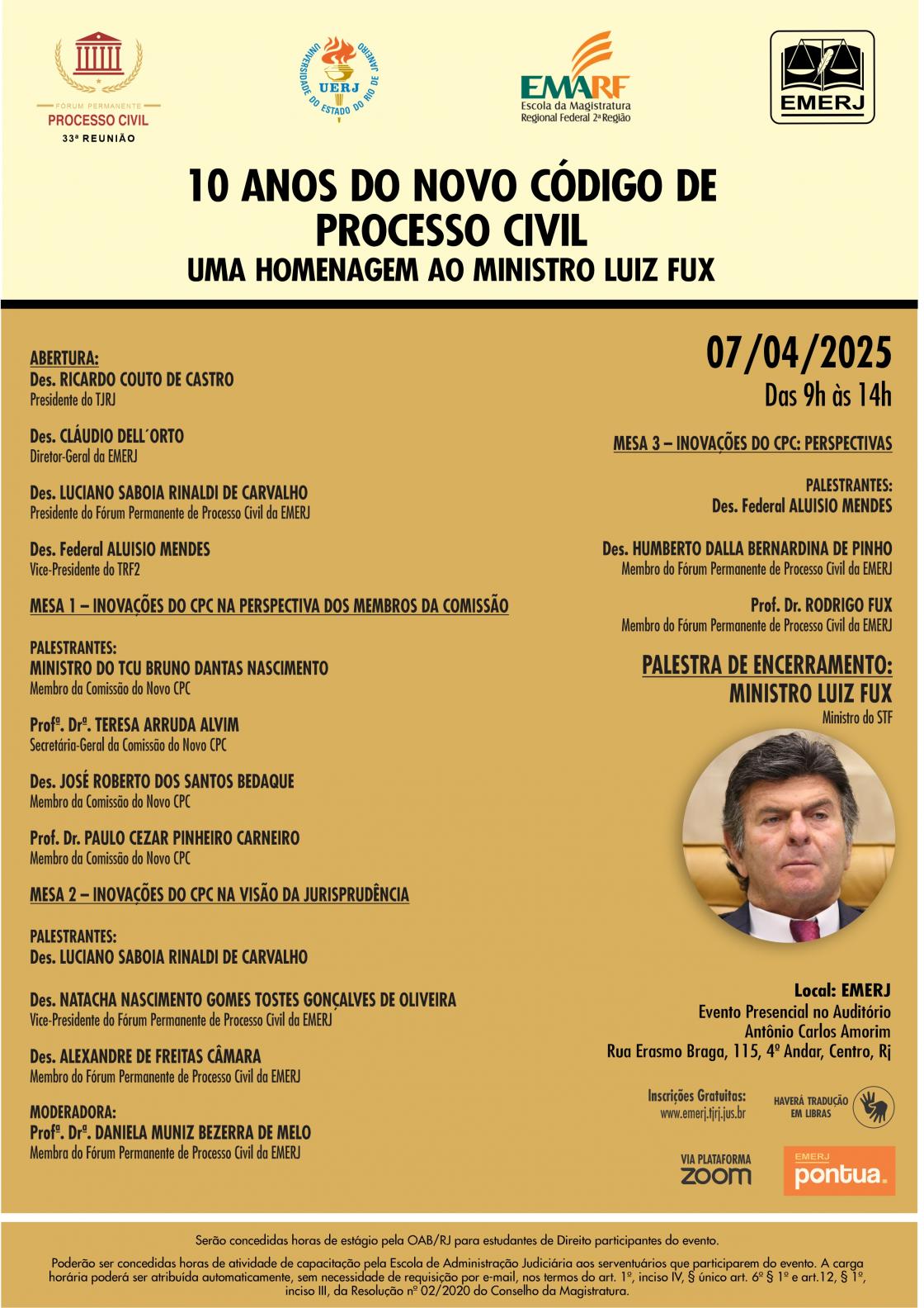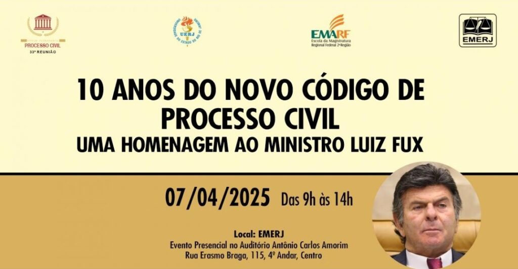 A Escola da Magistratura do Estado (EMERJ) realizará nesta segunda-feira (7), às 9h, o encontro “10 anos do novo Código de Processo Civil” em homenagem ao ministro Luiz Fux, do Supremo Tribunal Federal (STF). Presidente da comissão de juristas que elaborou o anteprojeto da Lei nº 13.105/2015, que regulamentou o CPC, o ministro fará a palestra de encerramento do evento.