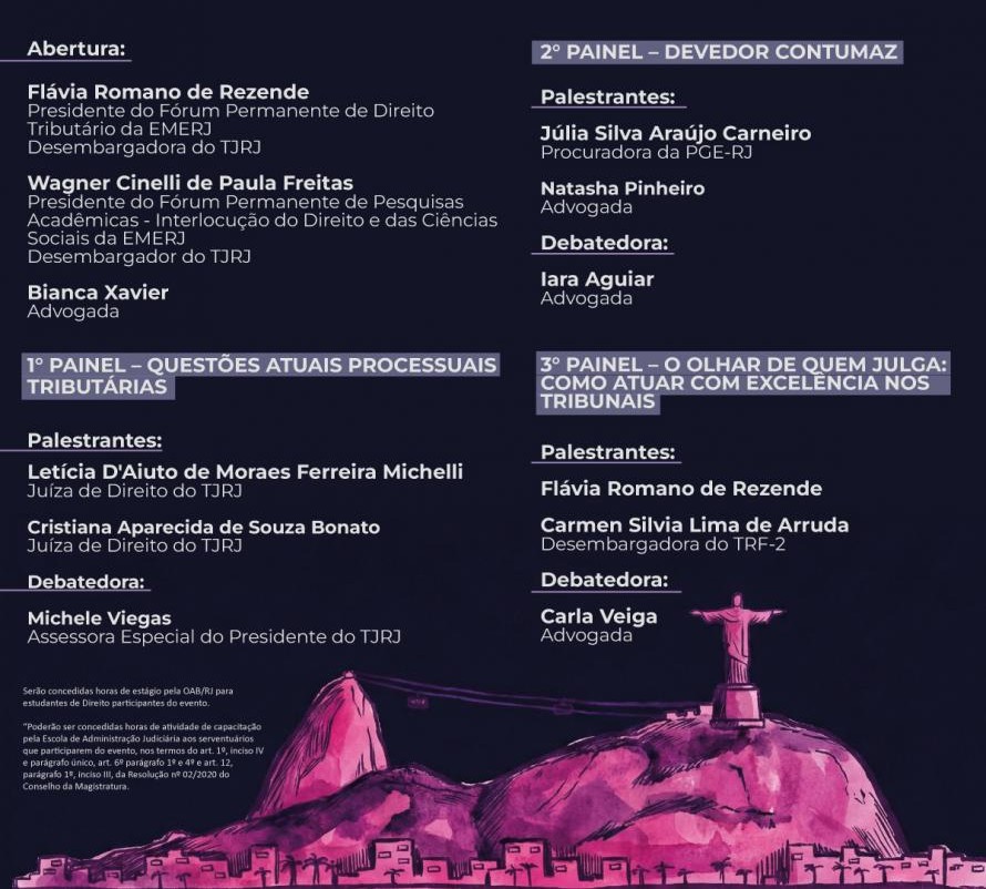 A abertura do encontro será conduzida pelos desembargadores Flávia Romano, que preside o Fórum Permanente de Direito Tributário da EMERJ, e Wagner Cinelli, presidente do Fórum Permanente de Pesquisas Acadêmicas – Interlocução do Direito e das Ciências Sociais. As juízas Leticia D’Aiuto e Cristiana Aparecida Bonato serão palestrantes no 1º painel, que tratará de questões atuais processuais tributárias.