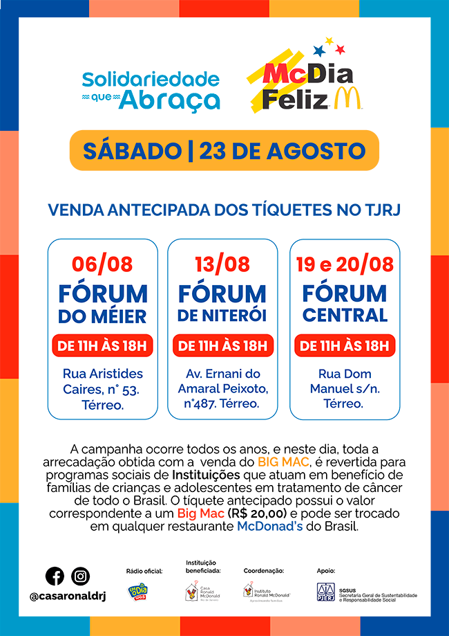 O Tribunal de Justiça do Rio de Janeiro (TJ-RJ), em parceria com a Casa Ronald McDonald RJ, promoverá a venda antecipada de tíquetes físicos da campanha McDia Feliz 2025 no Fórum Central (Centro do Rio), no Fórum do Méier (Zona Norte) e no Fórum de Niterói (Região Metropolitana). A renda será 100% revertida para a manutenção dos serviços da instituição, que acolhe gratuitamente crianças e adolescentes em tratamento contra o câncer.
