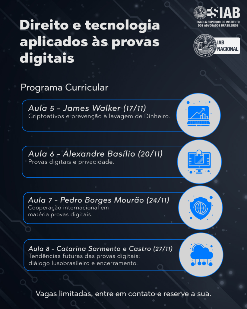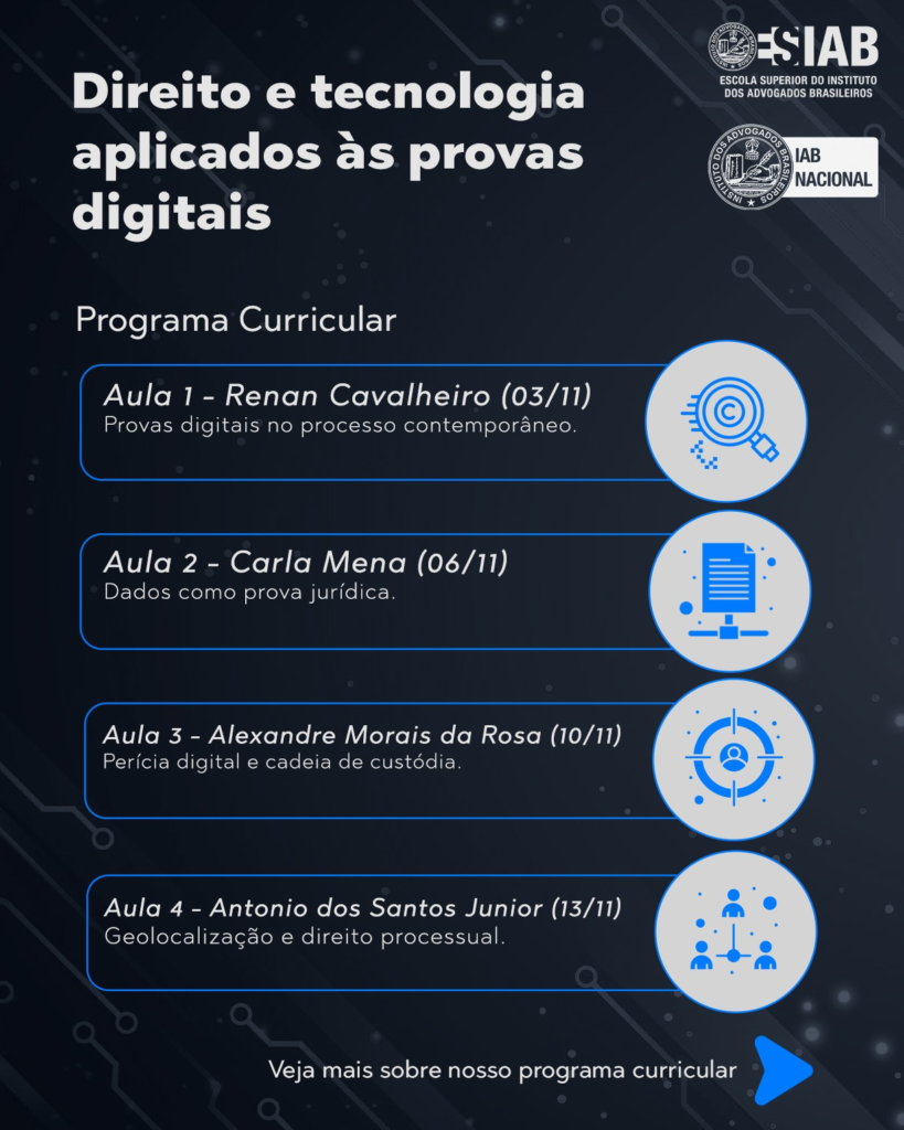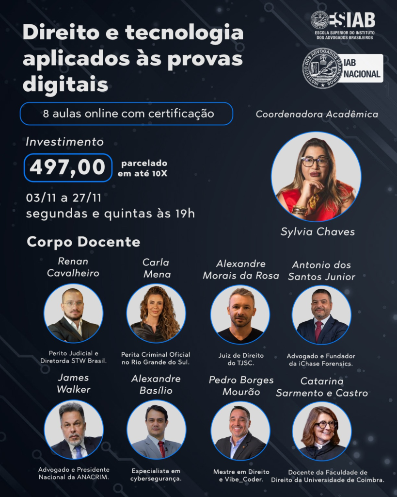 O curso será dividido em oito aulas, realizadas às segundas e quintas-feiras, a partir das 19h. A capacitação tem como objetivo preparar profissionais do Direito para enfrentar os desafios jurídicos contemporâneos, especialmente aqueles relacionados ao uso da tecnologia e às provas digitais. Inscreva-aqui.
