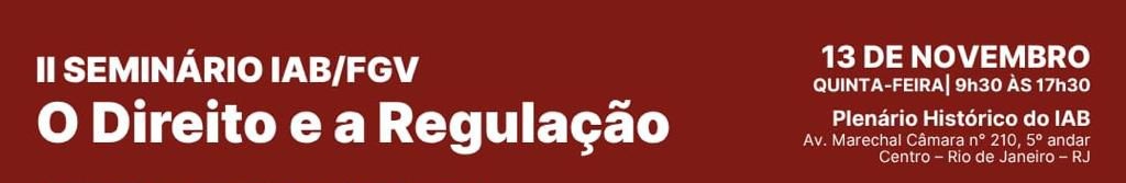 O Instituto dos Advogados Brasileiros (IAB), em parceria com a Fundação Getulio Vargas (FGV), realizará nesta quinta-feira (13) o seminário “O Direito e a Regulação”. O evento será composto por quatro painéis, que discutirão temas como teoria geral e fundamentos da regulação, regulação e instrumentos normativos, novos setores sob regulação e tópicos regulatórios críticos.