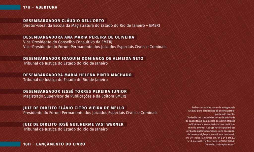 Além do autor do livro, estarão na abertura do encontro os desembargadores Cláudio dell’Orto (diretor-geral da EMERJ), Ana Maria Pereira de Oliveira (vice-presidente do Conselho Consultivo da EMERJ), Maria Helena Machado (presidente da Comissão Judiciária de Articulação dos Juizados Especiais – COJES) e Joaquim Domingos; o desembargador aposentado Jessé Torres (supervisor de publicações e da Editora EMERJ); e o juiz Flávio Citro (presidente do Fórum Permanente dos Juizados Especiais Cíveis e Criminais).