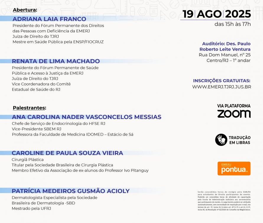 A Escola da Magistratura do Estado do Rio de Janeiro (EMERJ) realizará, em 19 de agosto, o seminário “Evidências científicas sobre o lipedema”. A abertura do evento será conduzida pelas juízas Adriana Laia, diretora de Acessibilidade e Inclusão da AMAERJ, e Renata de Lima Machado, conselheira de Estudos e Pesquisas da Associação.