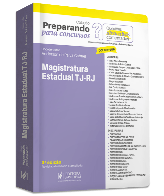 A Editora Juspodivm publicou, neste mês, a 3ª edição do livro de estudos para ingresso na Magistratura de Carreira do Estado do Rio de Janeiro. Coordenada pelo juiz Anderson de Paiva Gabriel, do Tribunal de Justiça do Rio (TJ-RJ), a obra faz parte da coleção “Preparando para concursos” e conta com questões discursivas comentadas por magistrados do TJ-RJ.