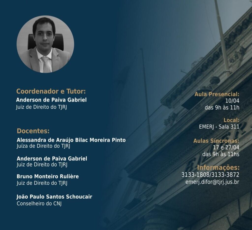 A Escola da Magistratura do Estado do Rio de Janeiro (EMERJ) promoverá, de 6 de abril a 8 de maio, o curso “Gestão Processual Penal”. A formação será coordenada pelo juiz Anderson de Paiva Gabriel. Também farão parte do corpo docente os magistrados Alessandra Bilac e Bruno Monteiro Rulière, e o conselheiro João Paulo Schoucair, do Conselho Nacional de Justiça (CNJ).