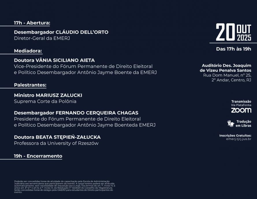 O evento será realizado das 17h às 19h, no Auditório Desembargador Joaquim de Vizeu Penalva Santos, localizado na Rua Dom Manuel, nº 25, 2º andar, no Centro do Rio de Janeiro. Haverá transmissão ao vivo pela plataforma Zoom. As inscrições podem ser feitas pelo site da EMERJ.