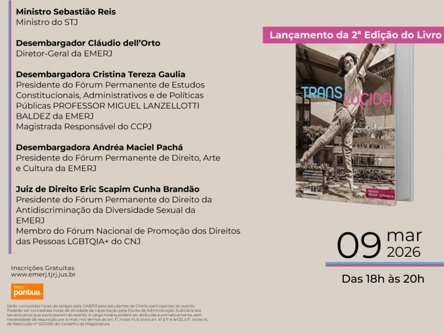 A Escola da Magistratura do Rio de Janeiro (EMERJ) promoverá, na próxima segunda-feira (9), a “Exposição Translúcida”, projeto organizado pelo ministro Sebastião Reis, do Superior Tribunal de Justiça (STJ). O evento contará com roda de conversa, mostra fotográfica e lançamento da 2ª edição do livro “Translúcida”. Participarão os desembargadores Cláudio dell’Orto, diretor da EMERJ, Andréa Pachá e Cristina Gaulia; e o juiz Eric Scapim.
