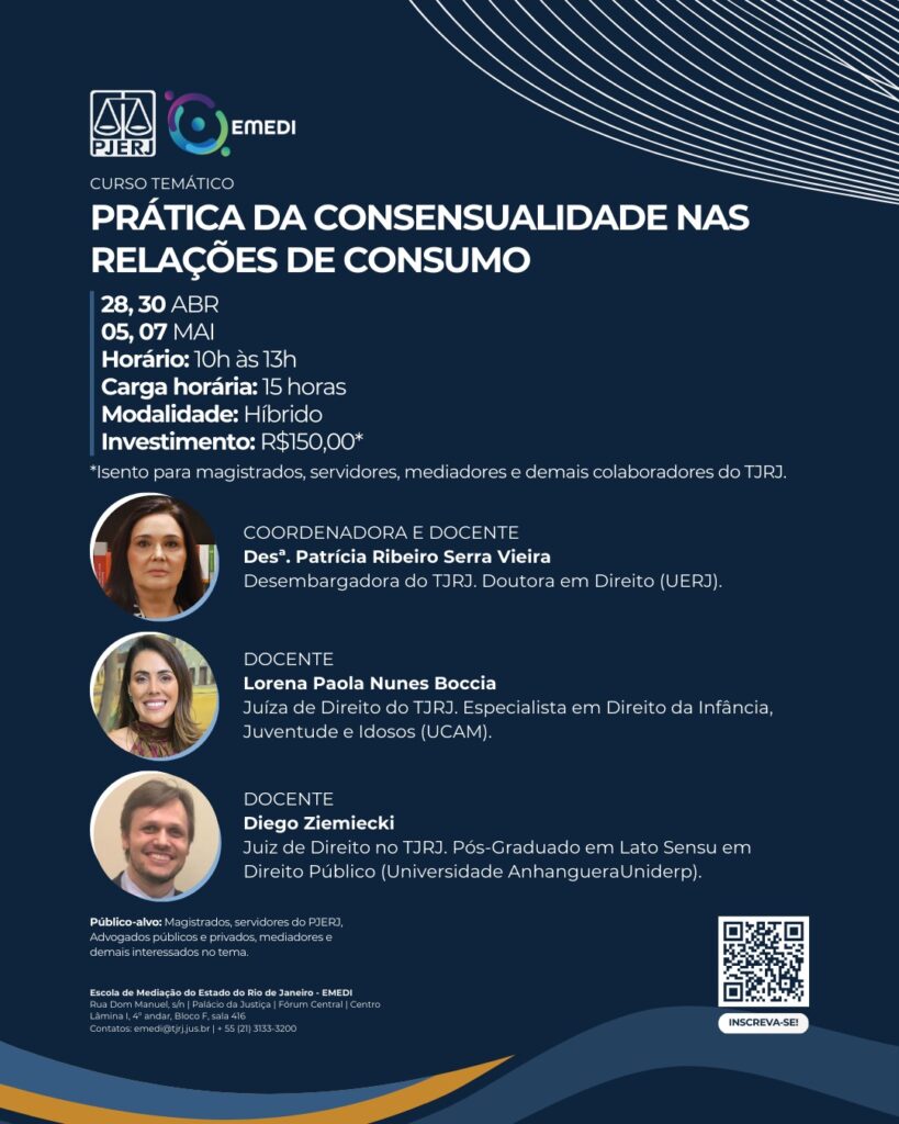 A Escola de Mediação (EMEDI), do Tribunal de Justiça do Rio de Janeiro (TJ-RJ), realizará o curso “Prática da Consensualidade nas Relações de Consumo”. Integram o corpo docente a desembargadora Patricia Serra Vieira (coordenadora) e os juízes Lorena Boccia e Diego Ziemiecki.