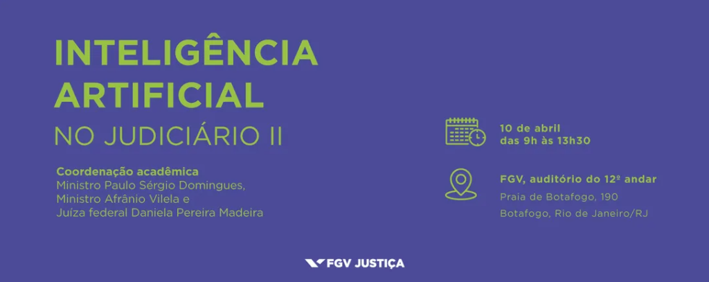A Fundação Getúlio Vargas (FGV) Justiça promoverá, no dia 10 de abril, a segunda edição do seminário Inteligência Artificial no Judiciário. Integram a programação do evento os ministros do Superior Tribunal de Justiça (STJ) Benedito Gonçalves, diretor-geral da Escola Nacional de Formação e Aperfeiçoamento de Magistrados (Enfam), Afrânio Vilela e Paulo Sérgio Domingues; a juíza Daniela Bandeira de Freitas, do Tribunal de Justiça do Rio de Janeiro (TJ-RJ); magistrados estaduais e federais; e especialistas no assunto.