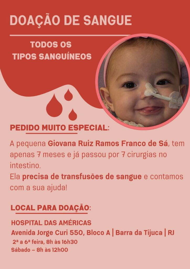 Giovana Ruiz Ramos Franco de Sá (7 meses), neta da dermatologista Tânia Ramos Franco de Sá, referenciada pela Mútua dos Magistrados, necessita de doações de sangue. Todos os tipos sanguíneos são aceitos. O local de doação é o Hemocentro São Lucas, situado no Hospital das Américas (Avenida Jorge Curi, 550 – Bloco A, Barra da Tijuca), de segunda a sexta-feira, das 8h às 16h30, e aos sábados, das 8h às 12h.