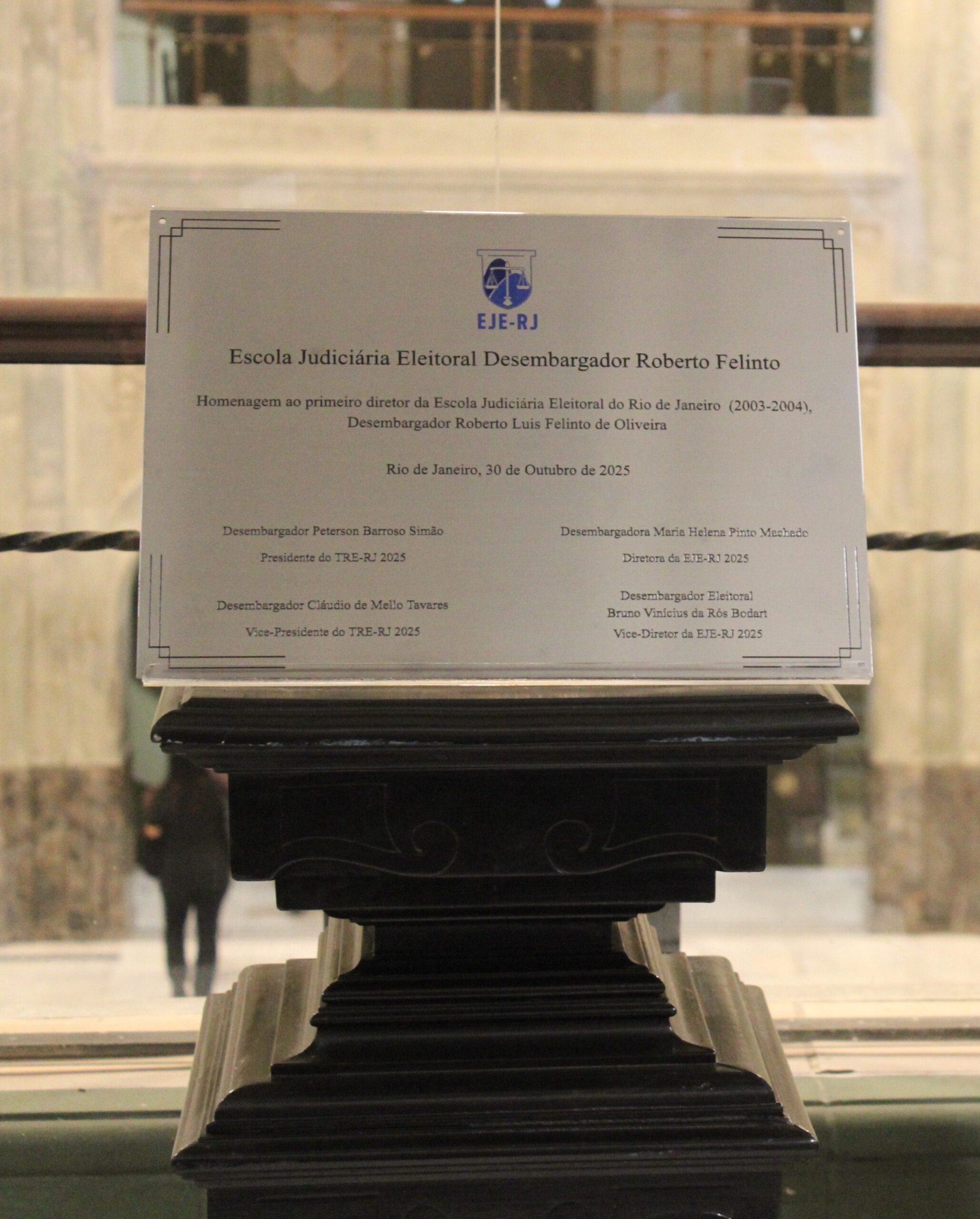 O Tribunal Regional Eleitoral do Rio (TRE-RJ) descerrou, nesta quinta-feira (30), a placa que oficializa a nova denominação da Escola Judiciária Eleitoral Desembargador Roberto Felinto (EJE-RJ). Presidente da AMAERJ no biênio 2008-2009, o saudoso magistrado foi o fundador e primeiro diretor da EJE, em 2003, e atuou como corregedor regional eleitoral de 2003 a 2005. A juíza Eunice Haddad, presidente da Associação, esteve no evento, que aconteceu no Palácio da Democracia, sede do TRE (Centro do Rio).