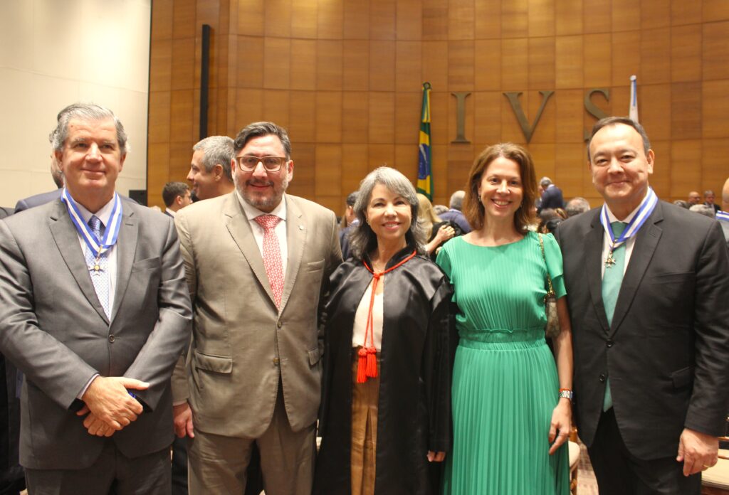 Realizaram a entrega das comendas os integrantes da Administração do TJ-RJ: desembargadores Ricardo Couto (presidente), Claudio Brandão (corregedor-geral da Justiça), Suely Lopes Magalhães (1ª vice-presidente), Maria Angélica Guedes (2ª vice-presidente) e Heleno Pereira Nunes (3º vice-presidente).