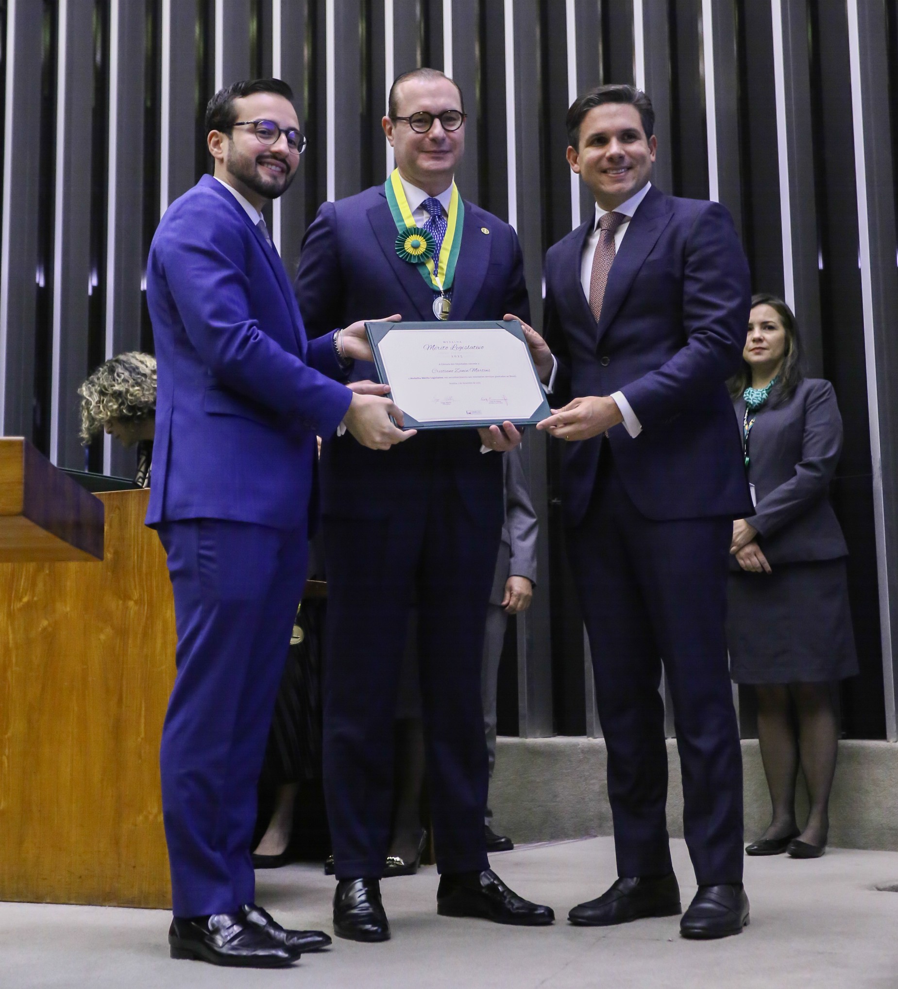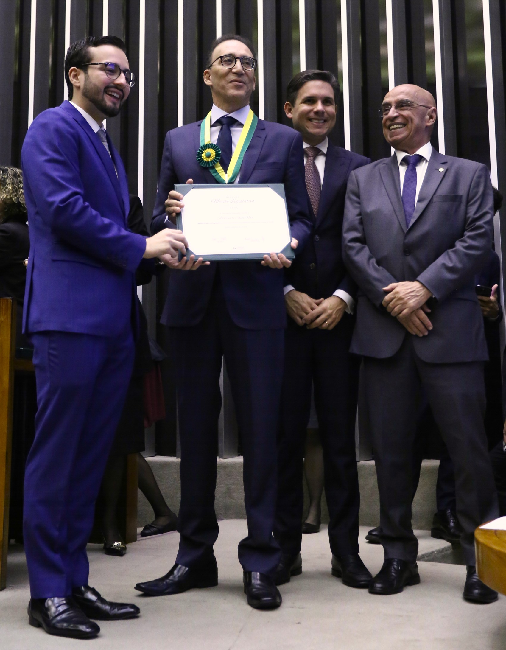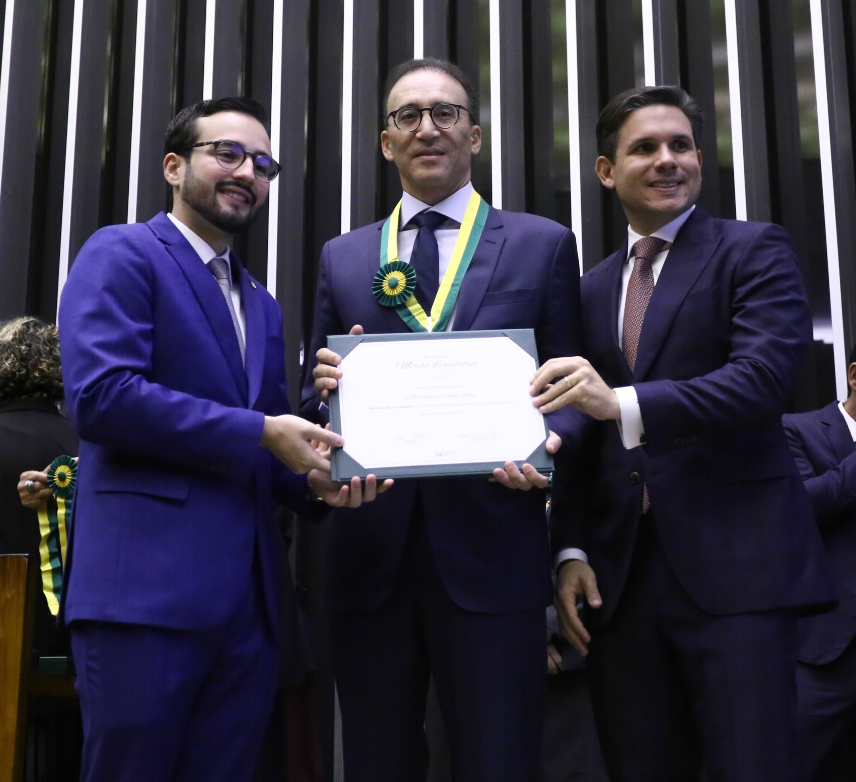 A Medalha do Mérito Legislativo foi entregue, nesta quarta-feira (3), aos ministros Dias Toffoli e Cristiano Zanin, do Supremo Tribunal Federal (STF), e ao juiz Alexandre Chini, do Tribunal de Justiça do Rio de Janeiro (TJ-RJ). A presidente da AMAERJ, juíza Eunice Haddad, esteve na solenidade, no plenário da Câmara dos Deputados, em Brasília.