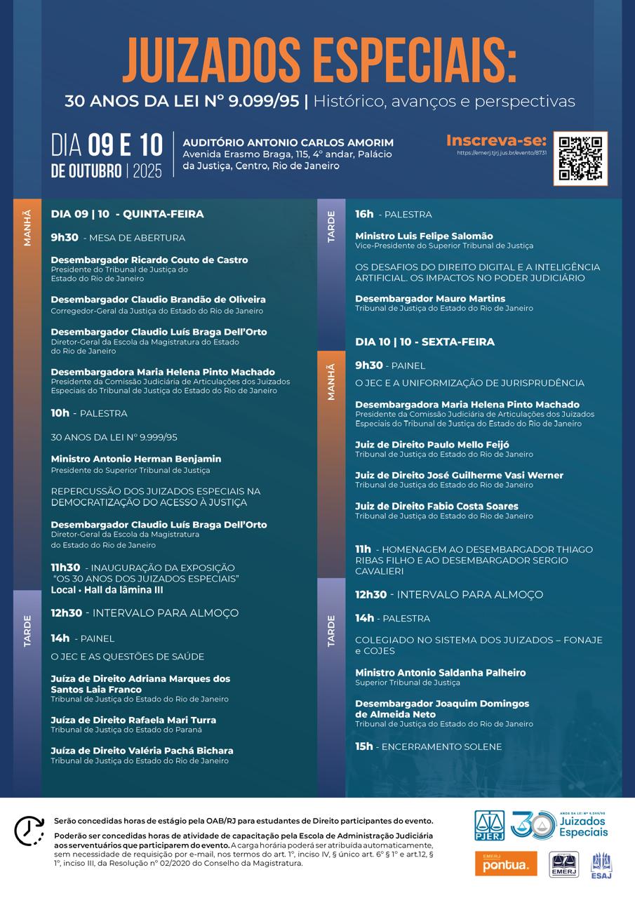 O histórico, os avanços e as perspectivas dos Juizados Especiais, criados pela Lei nº 9.099/1995, serão abordados em seminário no Tribunal de Justiça do Rio de Janeiro (TJ-RJ), nos dias 9 e 10 de outubro. Estarão presentes os ministros do Superior Tribunal de Justiça (STJ) Herman Benjamin (presidente), Luis Felipe Salomão (vice-presidente) e Antonio Saldanha; e 13 magistrados do TJ-RJ. Inscreva-se aqui.