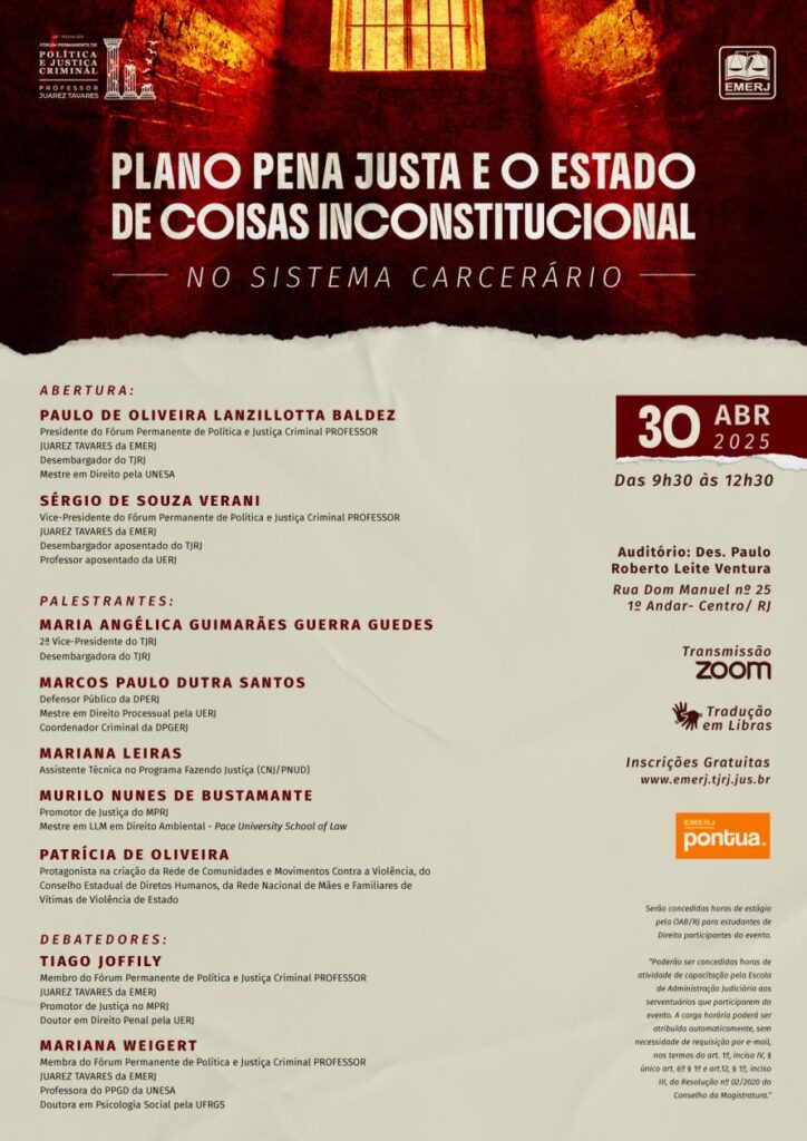 Os debatedores serão o promotor de Justiça Tiago Joffily e a professora Mariana Weigert. O “Pena Justa” é o Plano Nacional para o Enfrentamento do Estado de Coisas Inconstitucional nas Prisões Brasileiras. Foi elaborado pelo Conselho Nacional de Justiça (CNJ) em parceria com a União e com o apoio de parceiros institucionais e da sociedade civil.