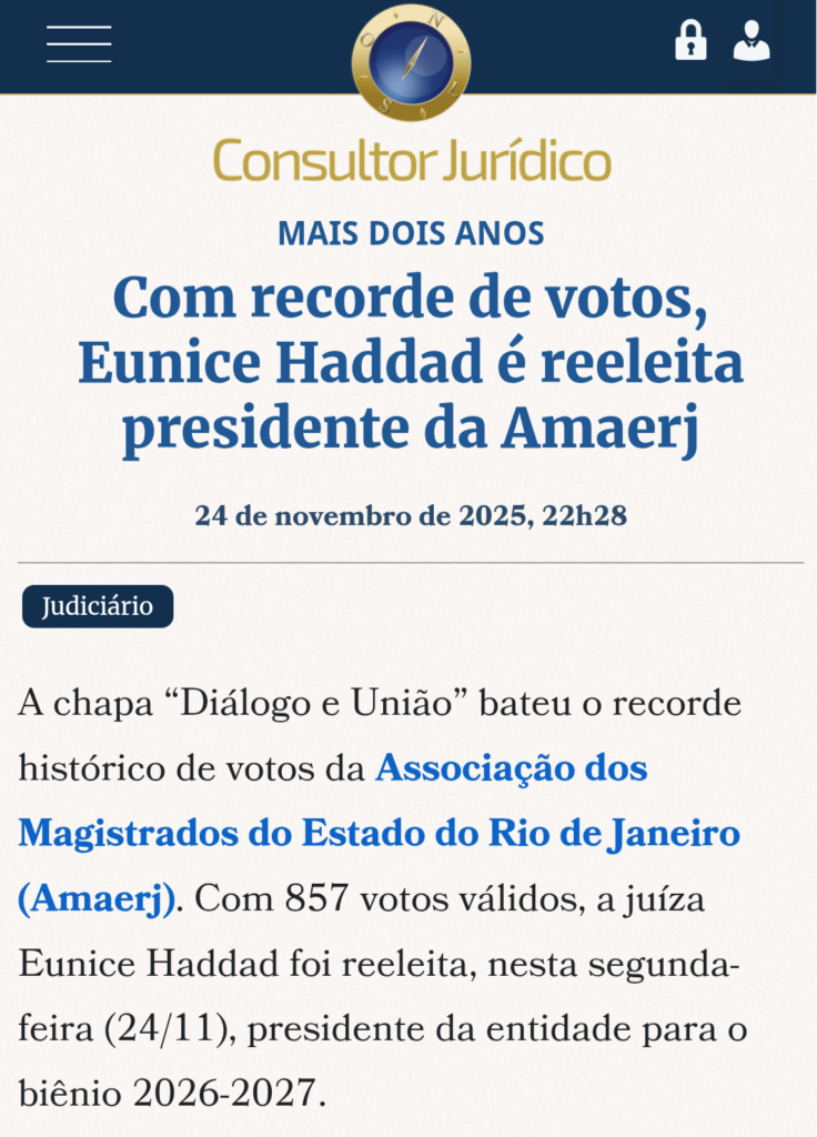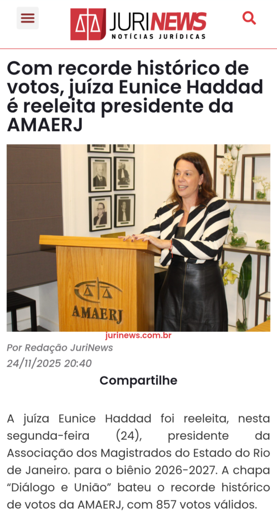 Leia também: Com recorde histórico de votos, juíza Eunice Haddad é reeleita presidente da AMAERJ