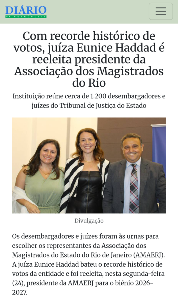 A eleição da chapa “Diálogo e União”, liderada pela presidente Eunice Haddad, foi divulgada por sites jornalísticos nestas segunda e terça-feiras (24 e 25). Portais nacionais e do Estado do Rio de Janeiro destacaram a votação recorde da AMAERJ.